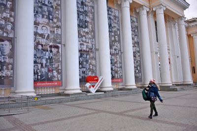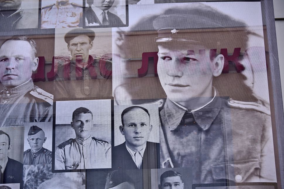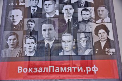 850 фотографий уральцев, ушедших на фронт со свердловского вокзала, напечатали на 12 полотнищах, каждое высотой 10 метров.