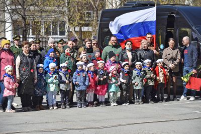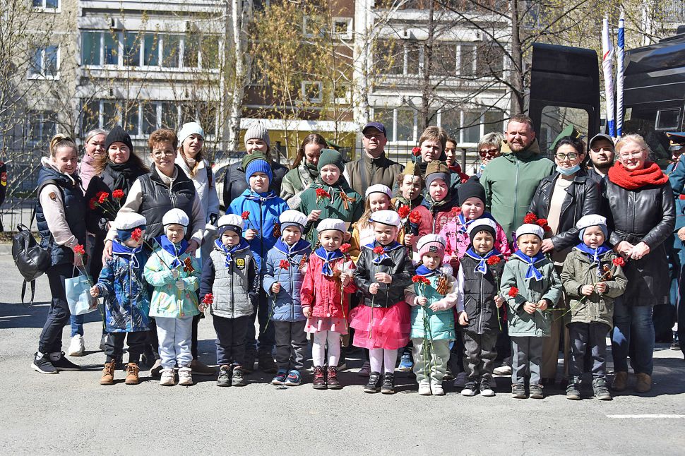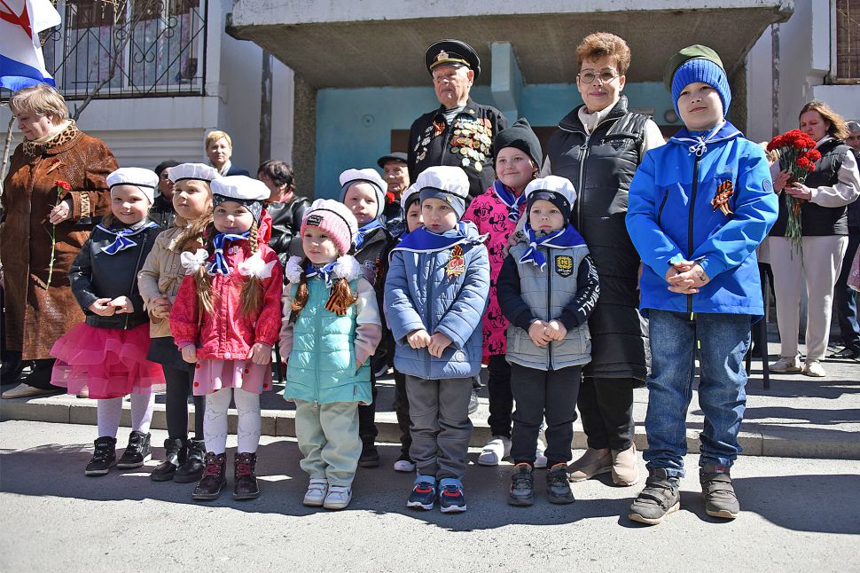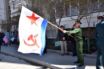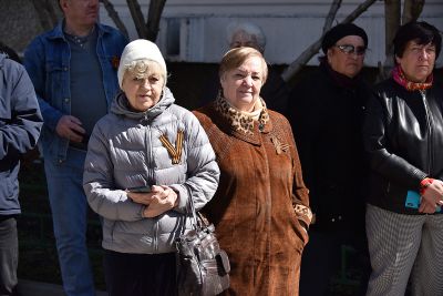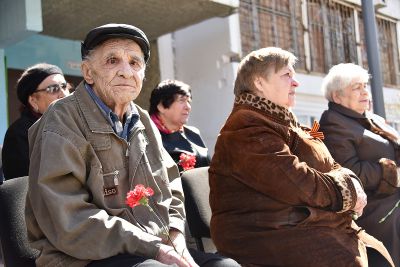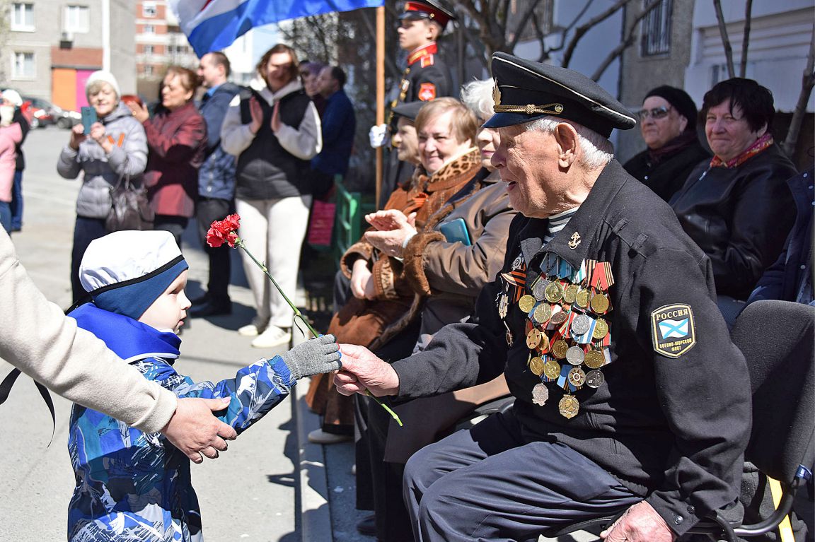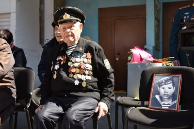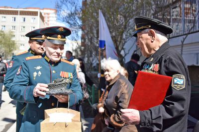 Участники акции во дворе его дома вручили фронтовику цветы, поздравительный адрес и праздничный набор.