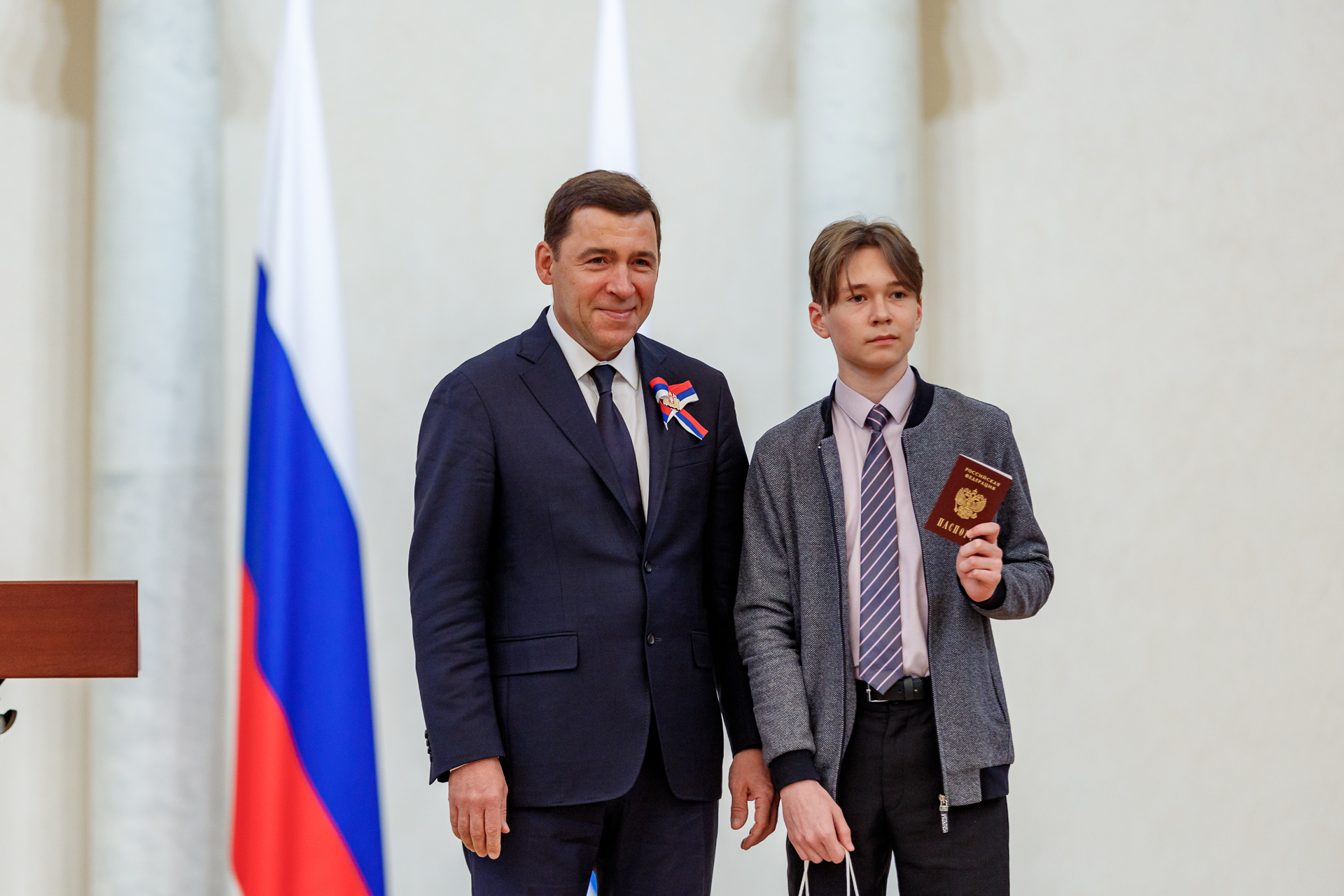 Чуть позже прошло вручение паспортов юным жителям Свердловской области, достигшим 14-летия. На торжественную церемонию в Дом Севастьянова были приглашены уральские школьники, особо отличившиеся в учебе, спорте, искусстве и общественной деятельности.