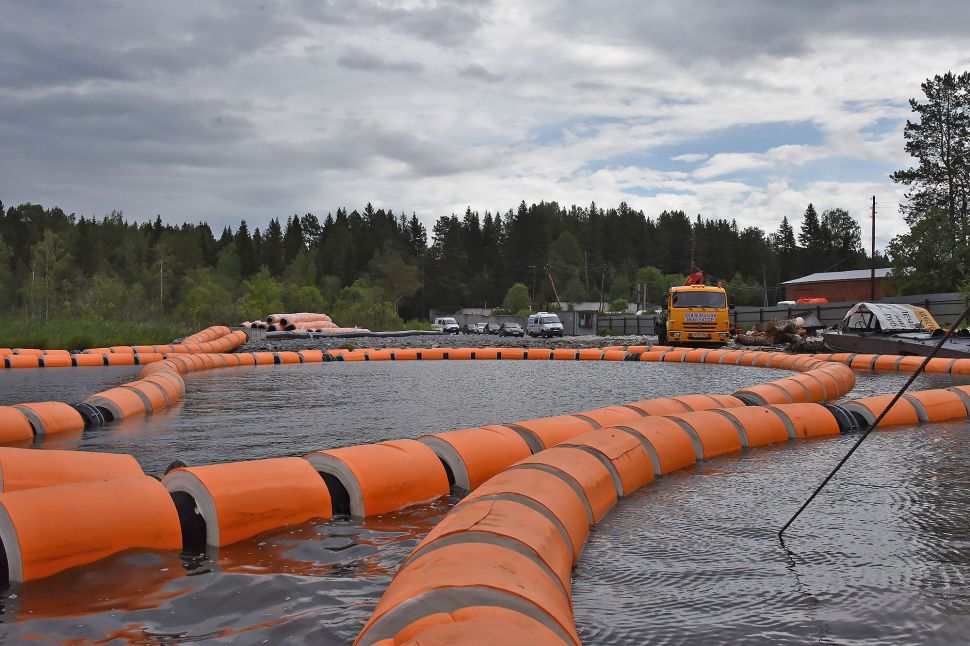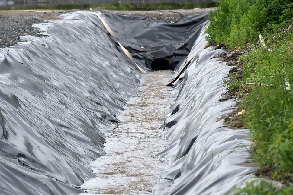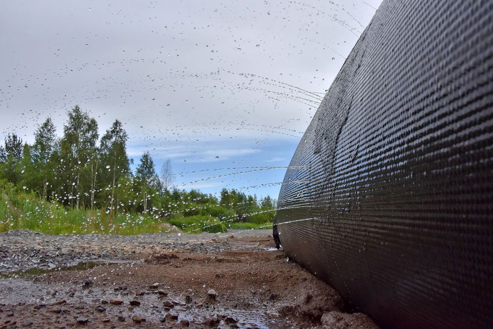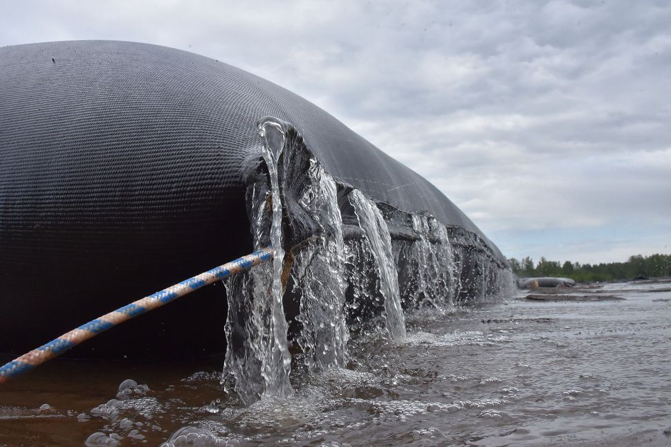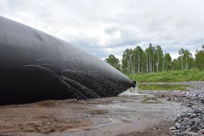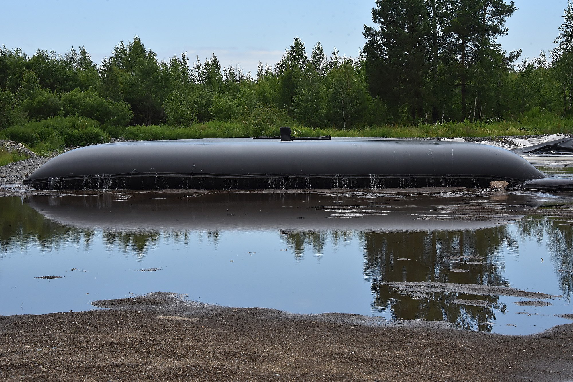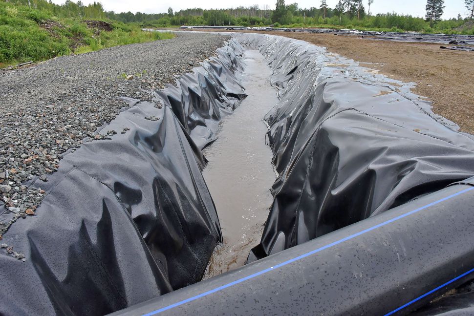 На площадке разложены геотубы — специальные мешки для сбора донных отложений. Ил остается в геотубах, а чистая вода выходит и поступает в водоотводные канавы. Оттуда вода попадает в отстойник, а затем вытекает в реку Черная.