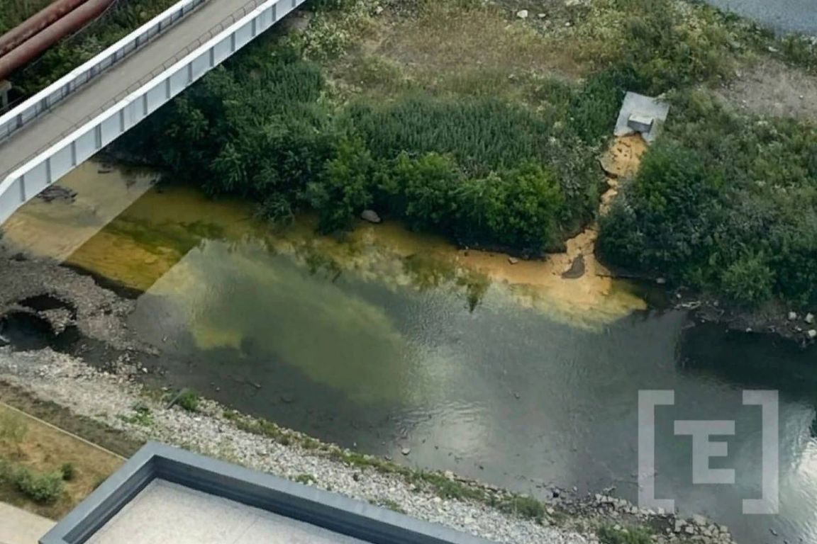 Утром жители Екатеринбурга заметили мутные зеленые отходы в реке Исеть в районе «Клевер Парка».