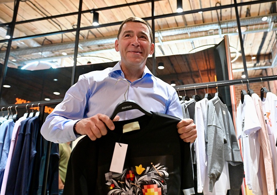 Затем Евгений Куйвашев посмотрел показ капсульной коллекции мерча, созданной в fashion-коворкинге «Домны». Уральские дизайнеры использовали в создании моделей работы фестиваля Stenograffia разных лет: принты, созданные по мотивам арт-объектов Сергея Акрамова, Кирилла Бородина, Тины Прохоровой, Светланы Растебиной, Анастасии Вокиной, Дмитрия Ламонова. Губернатор не удержался и приобрел футболку с росписью — элементами рисунка «Две крепости» художника Дмитрия Ламонова. Сама работа находится на улице Анны Бычковой на Синих камнях.