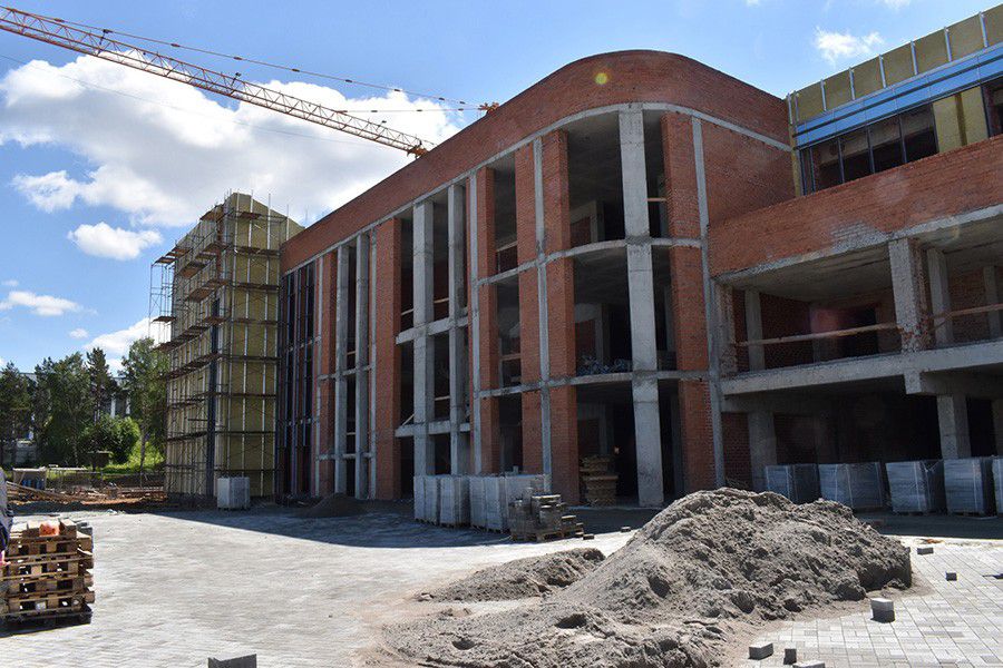 Практически завершен монтаж трехэтажной коробки здания, ведутся фасадные работы, прокладка инженерных сетей. К концу сентября строители замкнут тепловой контур здания, установят двери, витражи. Таким образом, зимой можно будет проводить внутренние отделочные работы.