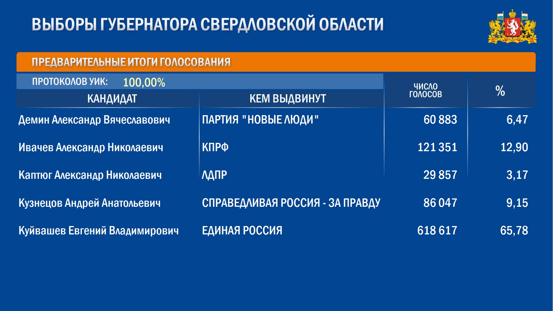 На Среднем Урале подвели итоги единого дня голосования. По данным ЦИК России, обработано 100% бюллетеней. Евгений Куйвашев с большим отрывом и показателем в 65,78% уходит на третий срок руководителя области. Напомним, что он представлял «Единую Россию».