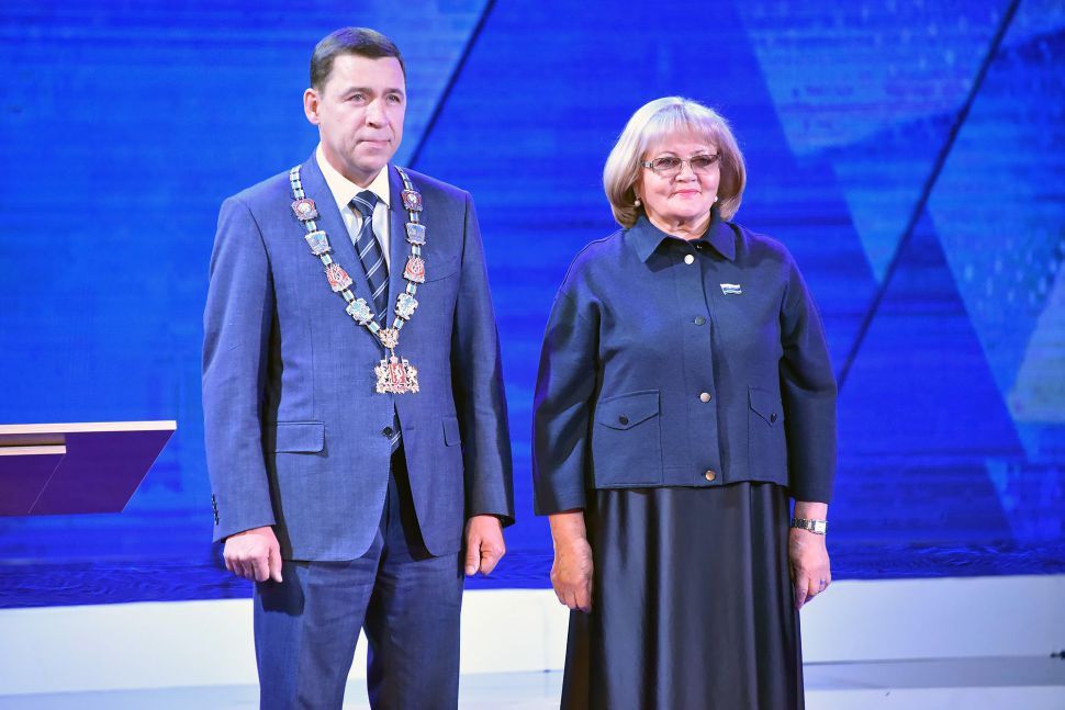 Председатель регионального законодательного собрания Людмила Бабушкина вручила знак губернатора Свердловской области Евгению Куйвашеву.