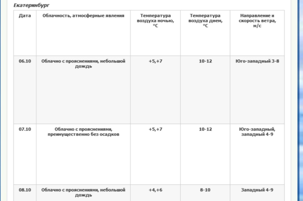 «В воскресенье и в первой половине следующей недели осадков немного, вероятны они в основном в северных районах Свердловской области и Пермском крае. Температура заметно понизится с 9 по 12 октября ночью +2,+7 градусов, днем +8,+13 градусов», —сообщила главный синоптик региона Галина Шепоренко.