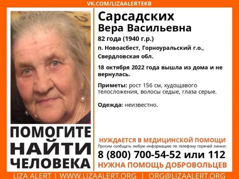 В Свердловской области 18 октября 82-летняя пенсионерка Вера Сарсадских ушла на прогулку в лес возле поселка Новоасбест Горноуральского городского округа и не вернулась. С тех пор ее поисками заняты полиция и волонтеры.