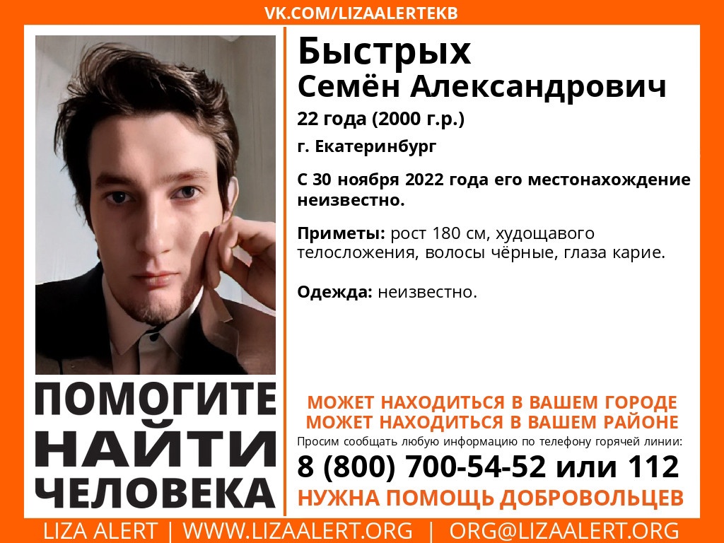 30 ноября в Екатеринбурге пропал 22-летний Семен Быстрых. Он перестал выходить на связь. Поисками занимаются полиция и волонтеры.
