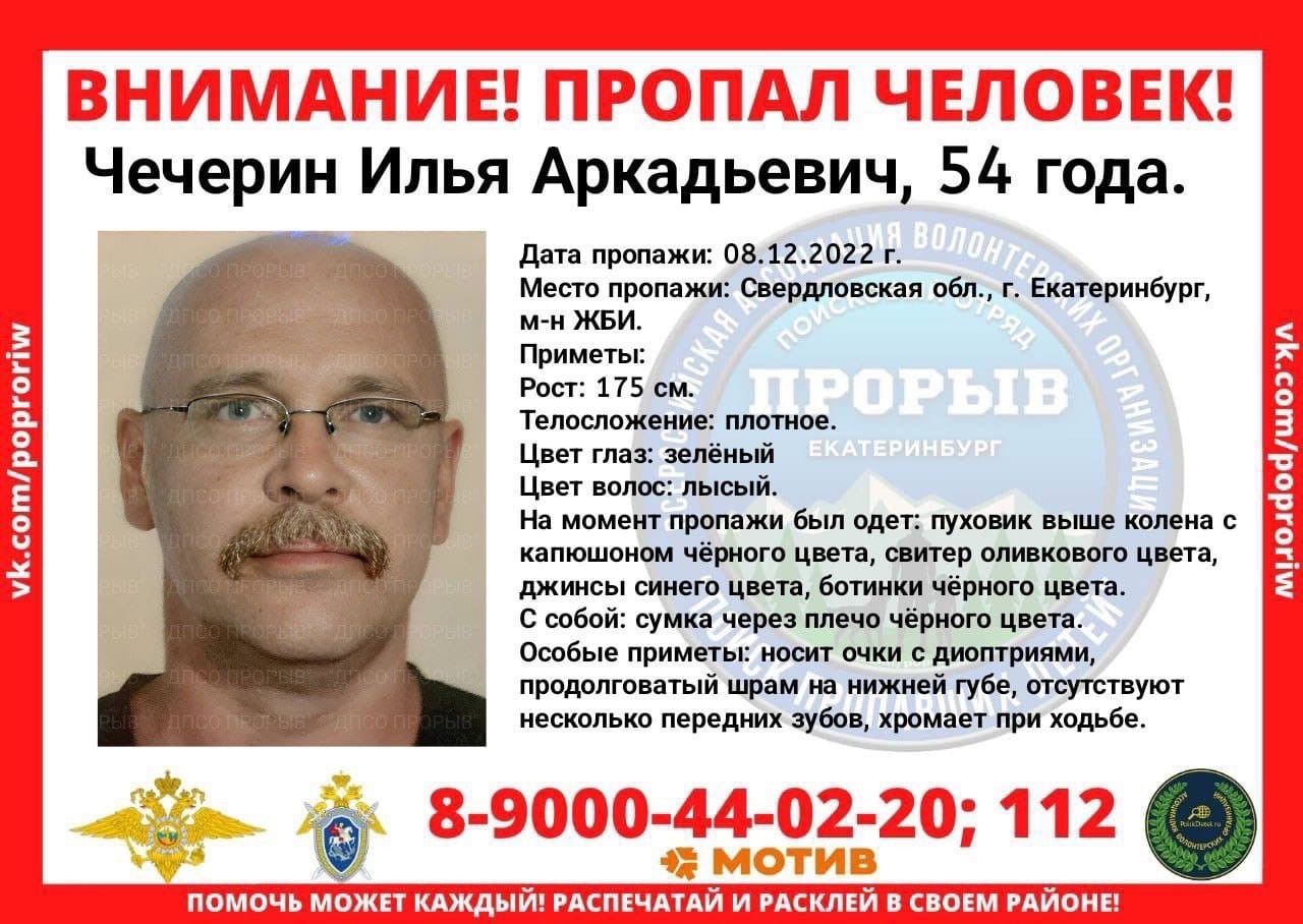 Всех, кто видел Илью Чечерина или знает о его местонахождении, просят звонить по номерам телефонов: +7 (343) 356-42-02 (полиция) и +7 (962) 316-55-42 (координатор поискового отряда «Прорыв»).