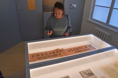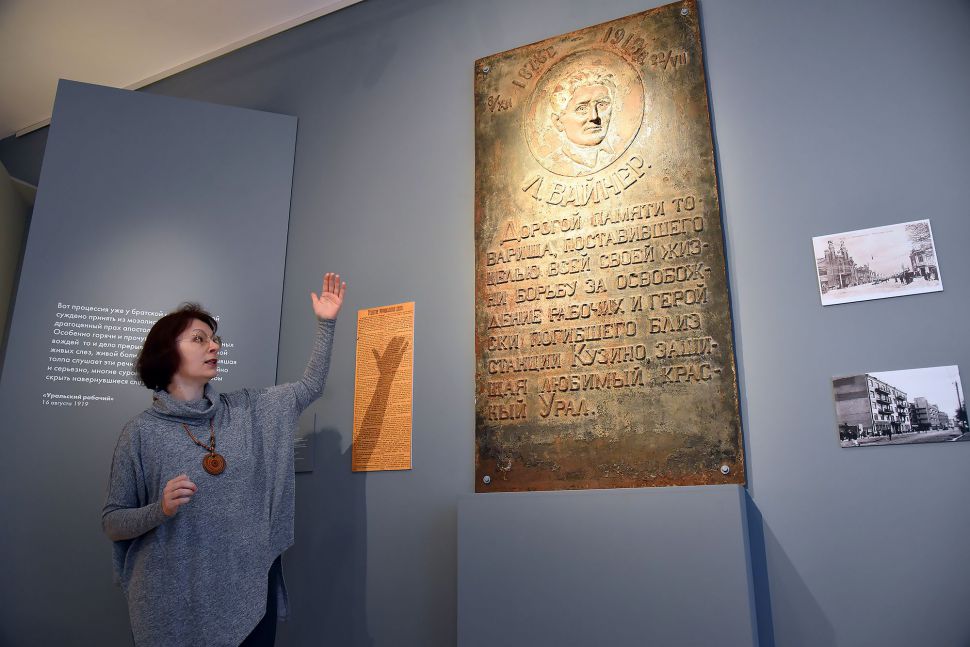 «Экскурсия по пространству Л52 предполагает знакомство с персоналиями: Леонид Вайнер, Яков Свердлов, Павел Бажов, Анна Бычкова, Борис Ельцин. Девятнадцатый год — это еще не Свердловск, это еще Екатеринбург, но для нас 1919 это не просто красивые цифры. 15 июля 1919-го — День освобождения от войск Колчака. Эта дата стала памятной, к ней будут были приурочены открытия заводов, перерезались ленточки до середины тридцатых годов, до периода репрессий. Несколько слов о дизайне. Мы, например, объединили в единое радиальное музейное пространство вырезки из газеты «Уральского рабочего» того времени, которые описывают, как было эксгумировано тело революционера-подпольщика Леонида Вайнера и проходили похороны в Екатеринбурге, а также саму памятную табличку», — делится экскурсовод Екатерина Калужникова