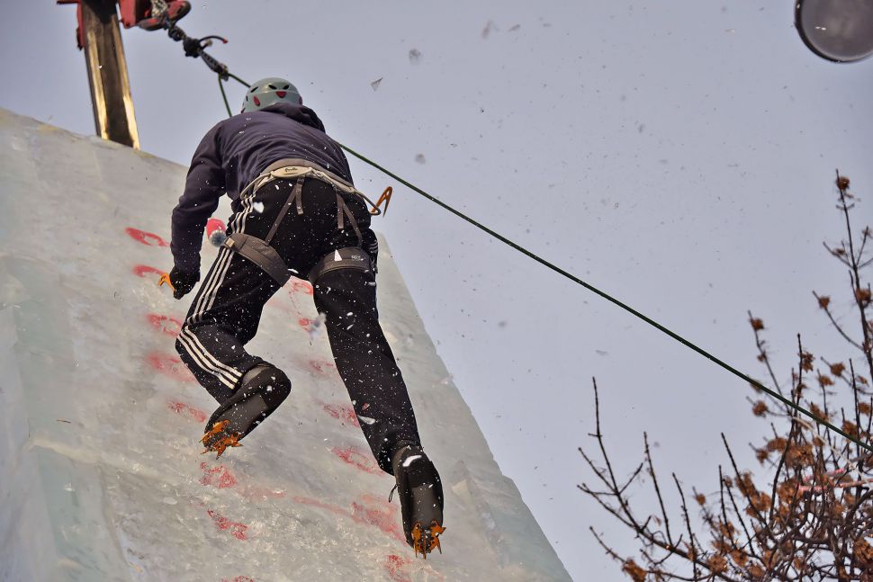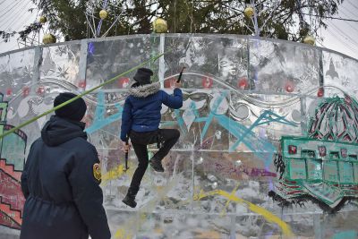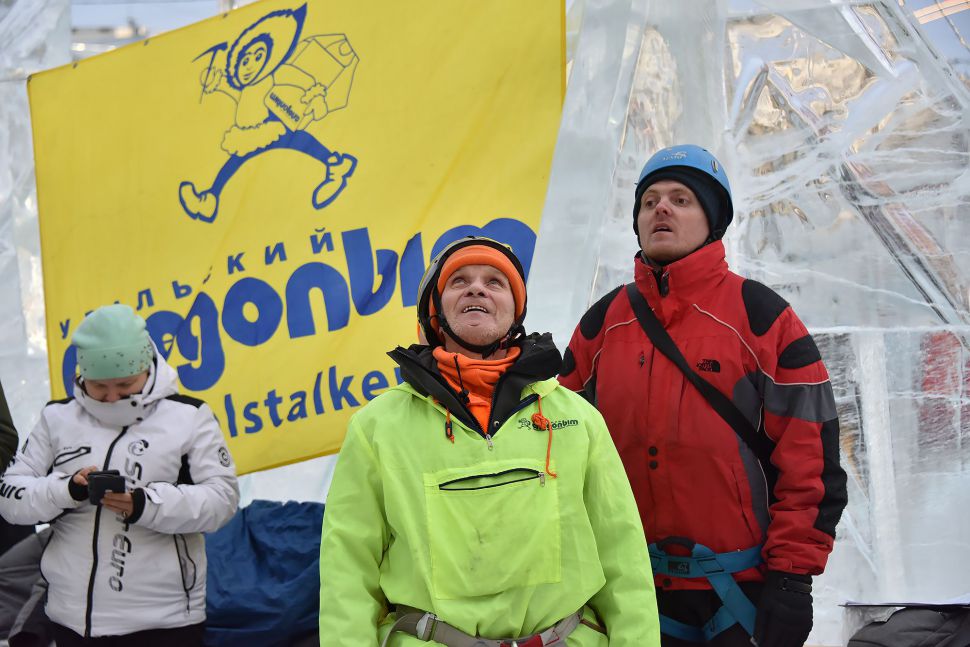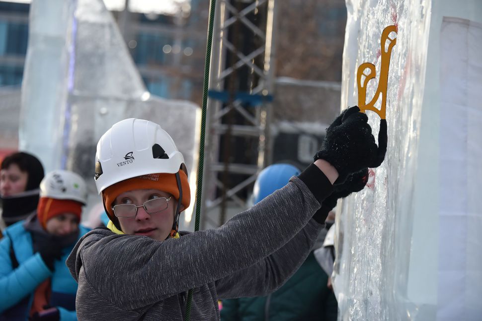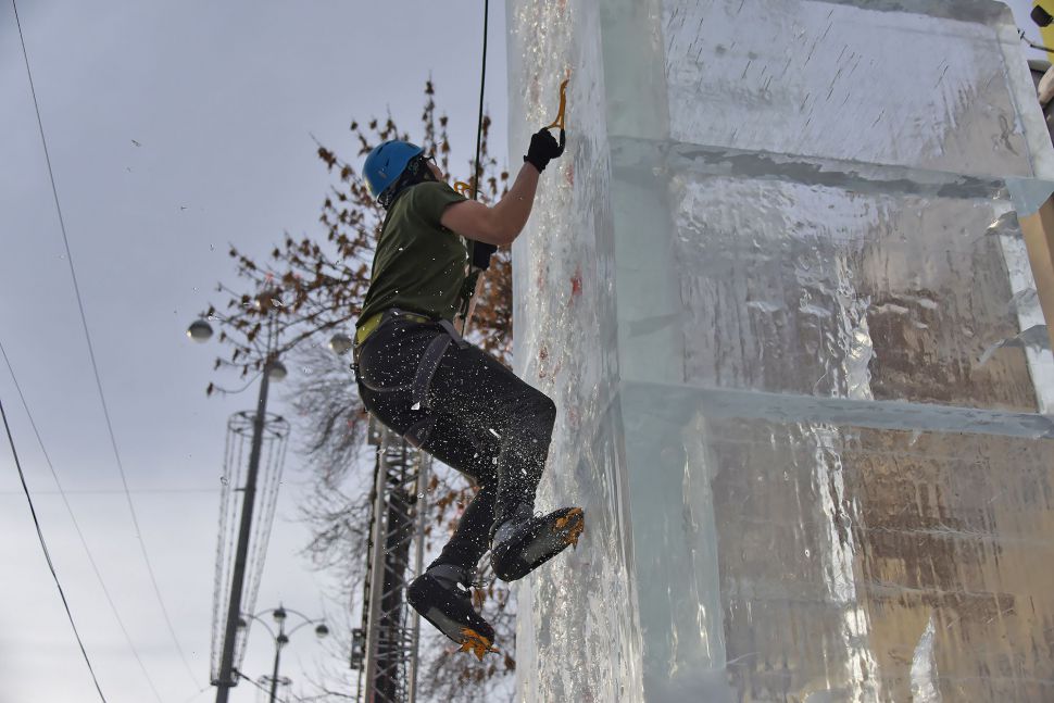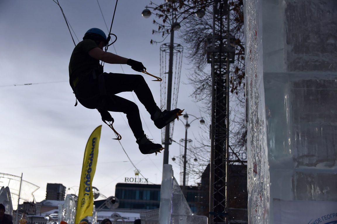 Участники соревнований на скорость взбирались на ледовую колонну высотой около 14 метров. Самые маленькие ледолазы пробовали свои силы на стене, ограждающей главную новогоднюю елку Екатеринбурга.