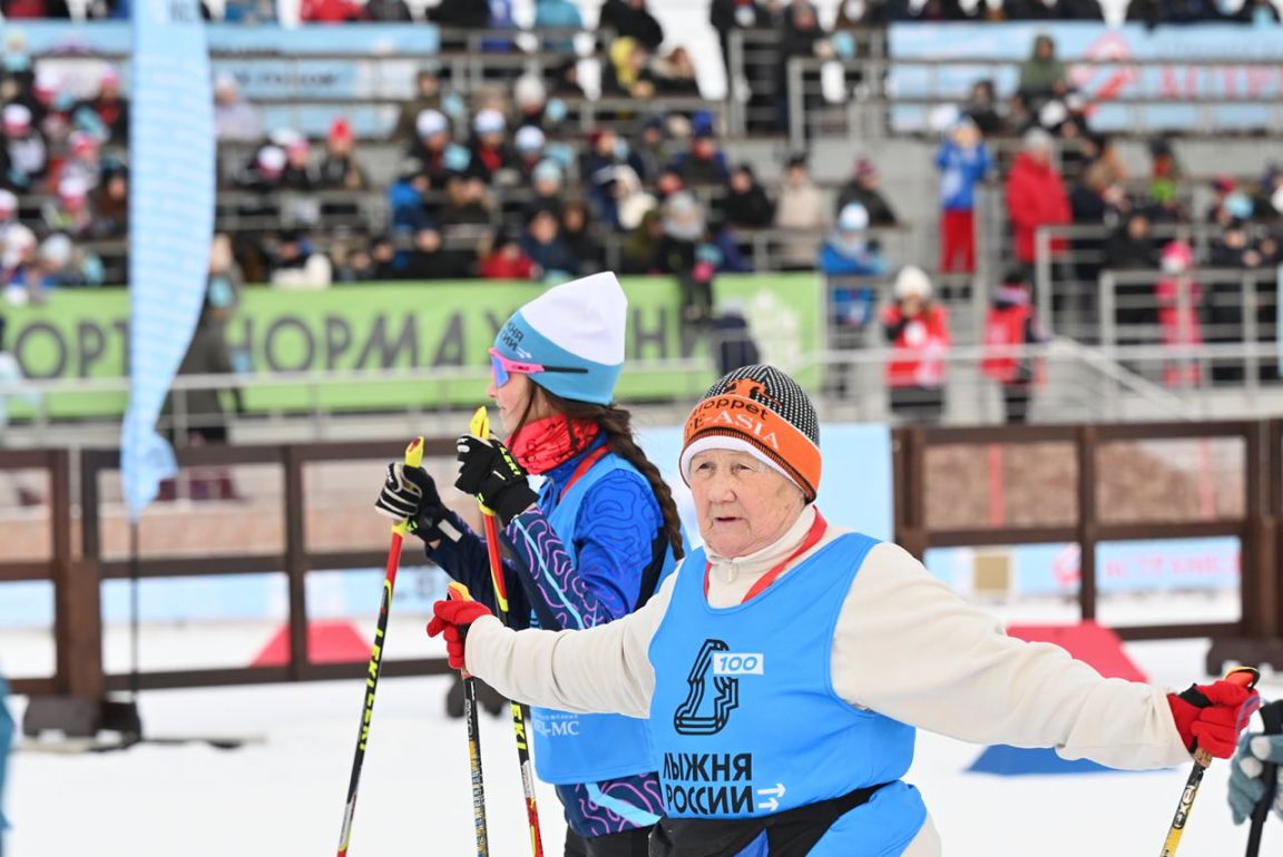 На лыжне спортшколы «Аист» первыми вышли на страт почетные гости. Они пробежали дистанцию 1923 метра, символизирующую 100-летие создания органов спорта в России и Свердловской области.