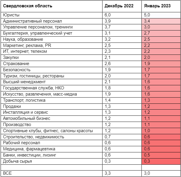 В Свердловской области на одну вакансию приходится всего 3 активных резюме, что на 0,3 пункта меньше аналогичного показателя за декабрь. Это говорит о том, что рынок труда на Среднем Урале испытывает серьезную нехватку кадров, сообщает hh.ru.