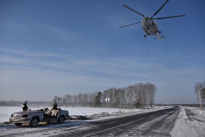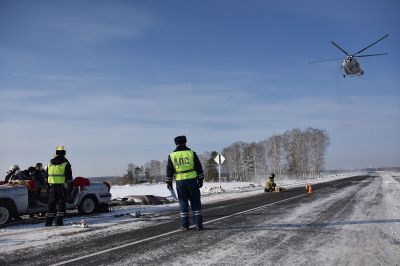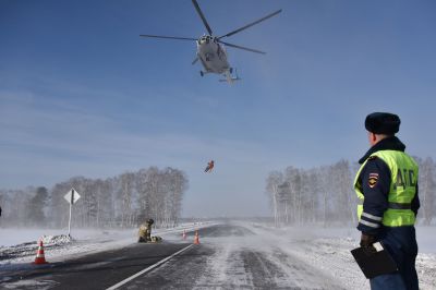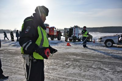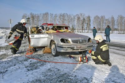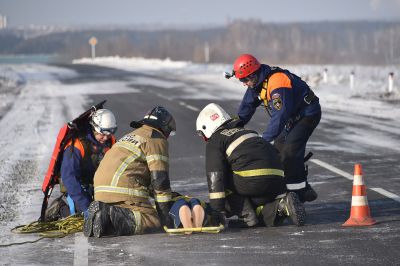 По сигналу диспетчера регионального управления автодорог спецтранспорт расчистил опасный участок дороги. В течение нескольких минут к «месту происшествия» подъехал экипаж ГИБДД для выяснения обстоятельств случившегося. Автоинспекторы вызвали службы МЧС и центра медицины катастроф. Спасатели разрезали «разбившуюся» Волгу, извлекли пострадавших, одного из которых эвакуировал вертолет. Позже прибыл пожарный расчет, чтобы не допустить возгорания легковушки.