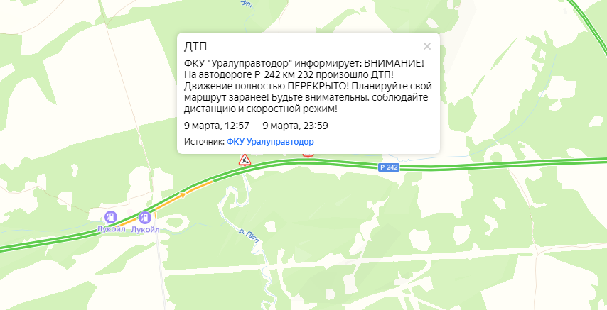 «На автодороге Р-242 (232 километр) произошло ДТП. Движение полностью перекрыто. Планируйте свой маршрут заранее. Будьте внимательны, соблюдайте дистанцию и скоростной режим», — сообщили в «Уралуправтодоре».