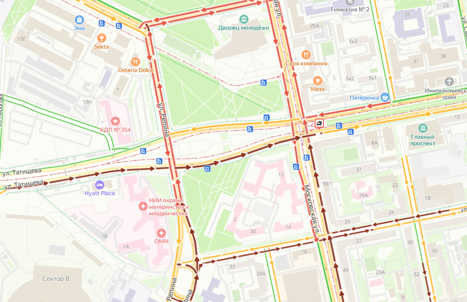 Из-за перекрытия в центре города образовались огромные пробки. Затруднен проезд по улицам Татищева, Малышева, Репина и Попова.