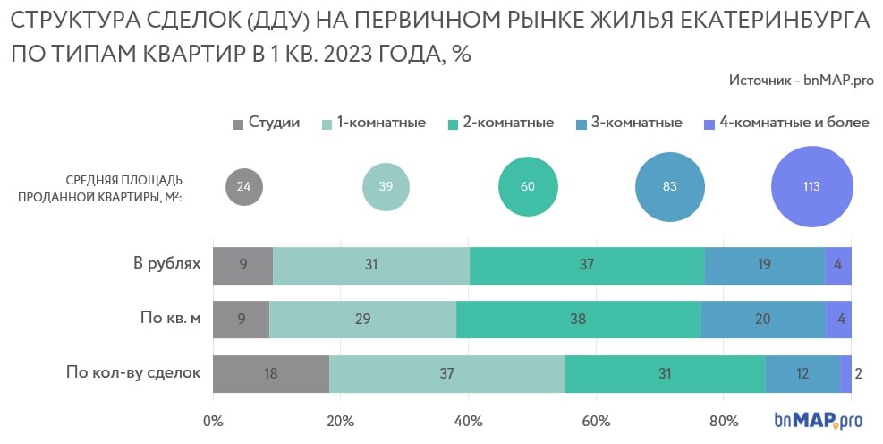 В Екатеринбурге в структуре сделок на первичном рынке недвижимости лидируют однокомнатные квартиры. На этот сегмент по числу покупок приходится 37% от общего объема, сообщил в своем telegram-канале глава аналитического отдела Уральской палаты недвижимости (УПН) Михаил Хорьков со ссылкой на данные платформы bnMAP.pro.