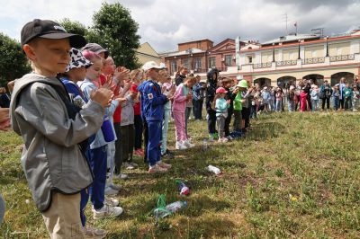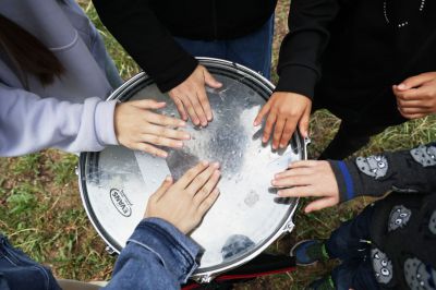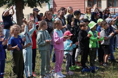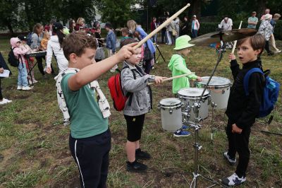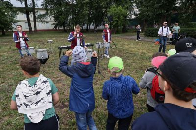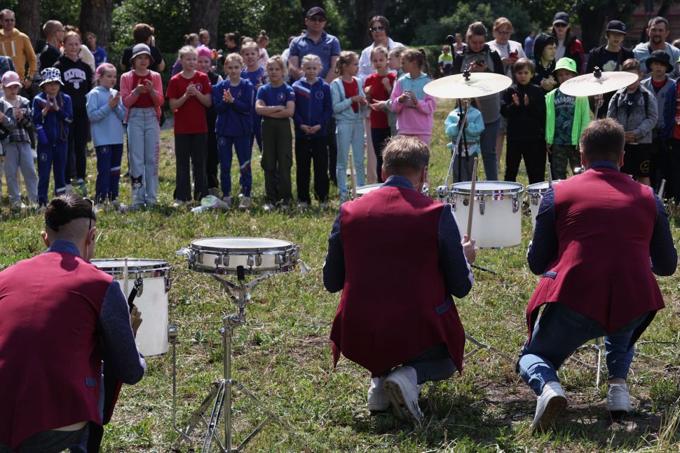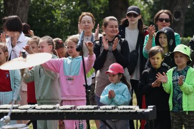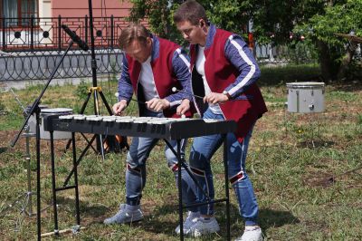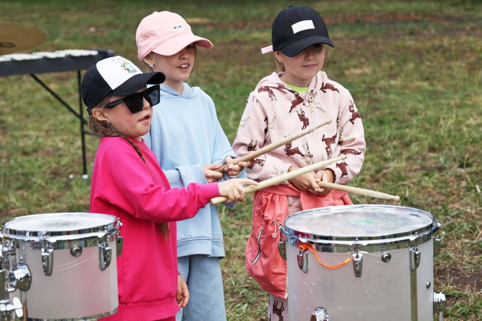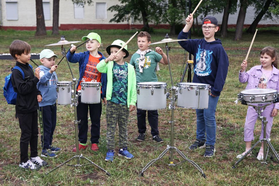 После зарядки музыканты отдали палочки детям и познакомили с своими инструментами.