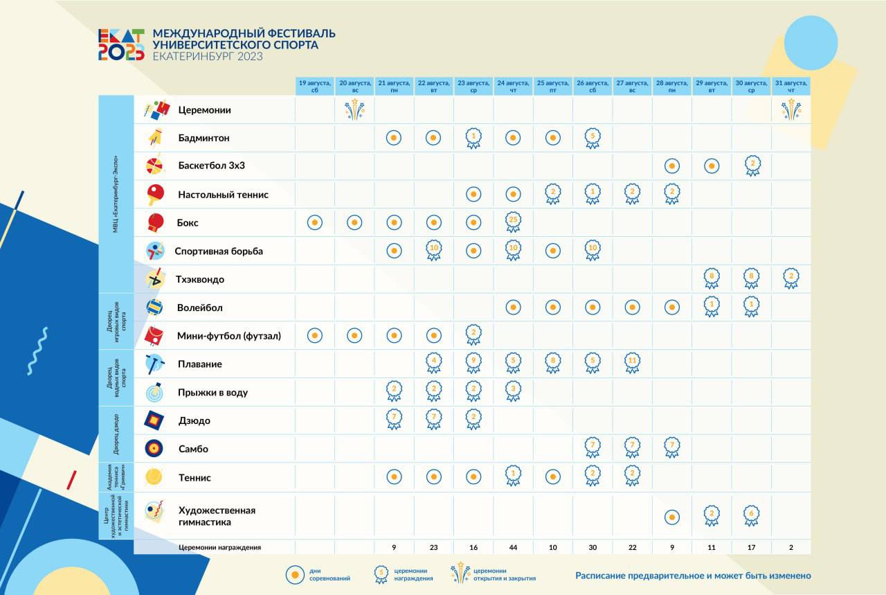 На официальном сайте Международного фестиваля университетского спорта опубликовали расписание спортивной программы. Там же можно оставить заявку на покупку билетов.