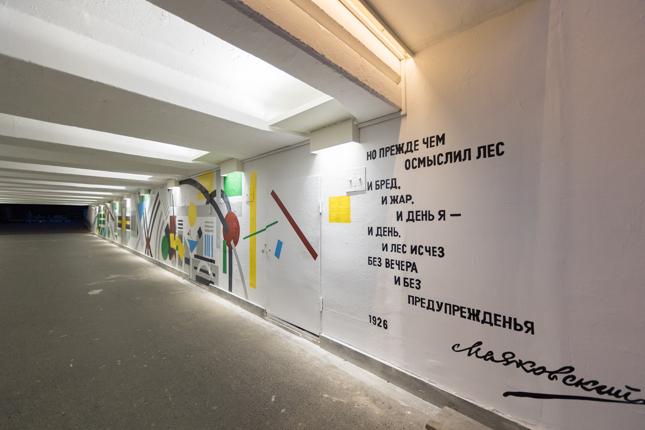 Помимо освещения, в переходе появилось новое граффити, напоминающее горожанам об эпохе конструктивизма, во времена которой фактически главная площадка отдыха горожан начала свою работу. Проект реализован совместно с Алиной Рахматулиной, продюсером проектов в сфере культуры, и уличным художником Максимом Реваншем. На стенах обновленного городского пространства появились стихи Владимира Маяковского.