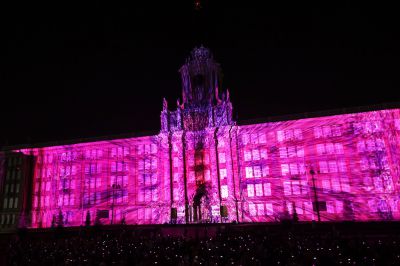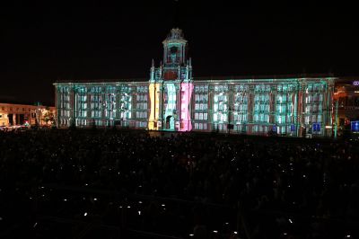 Картинку на здание администрации передавали 24 проектора мощностью по 40 тысяч люмен каждый. Световые машины установили в специальной башне на площади 1905 года.