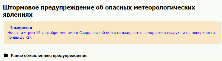 Уральский гидрометцентр объявил штормовое предупреждение из-за надвигающихся заморозков — ночью и утром 16 сентября местами в Свердловской области ожидается до 2 градусов ниже нуля.