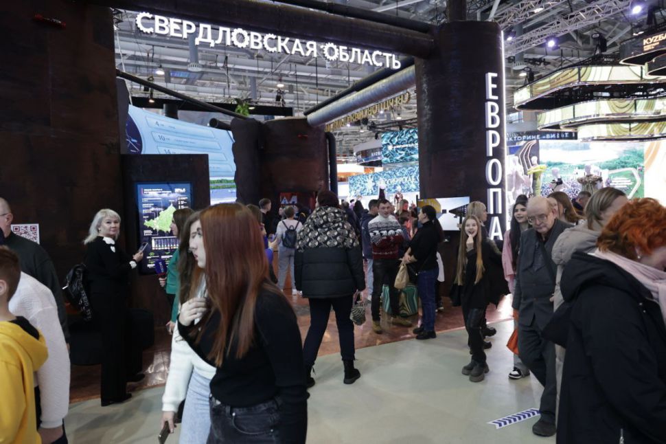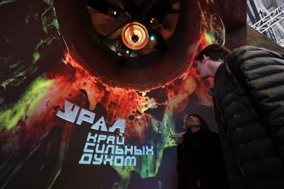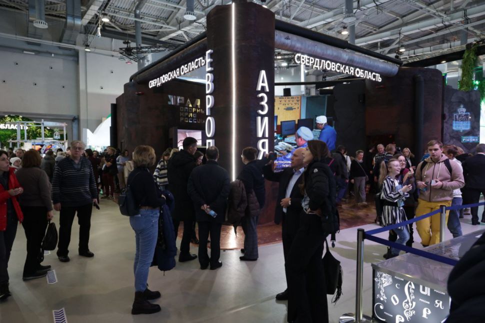 Ключевая идея экспозиции Свердловской области — показать историческое развитие региона сквозь призму промышленности от Демидовских заводов до будущих научно-технических достижений. В открытом пространстве, созданном в в стиле промышленного лофта с заводскими мотивами, звучит музыка и техногенные звуки.