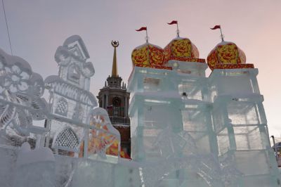 Над созданием городка трудились более 200 человек: заготовщики льда, слесари, плотники, монтажники, электрики и водители. Для возведения снежной сказки в центр уральской столицы привезли более 500 кубометров льда.