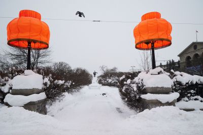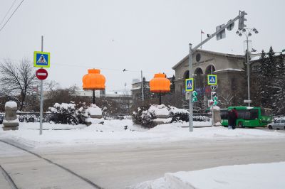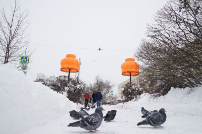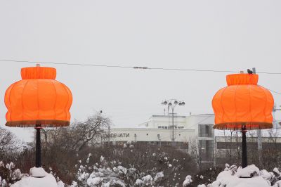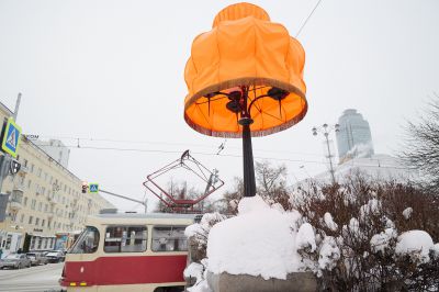 Уличный художник Тимофей Радя вновь украсил фонари на аллее у театра «Урал Опера Балет» оранжевыми абажурами. Их установили в ночь на 12 января.