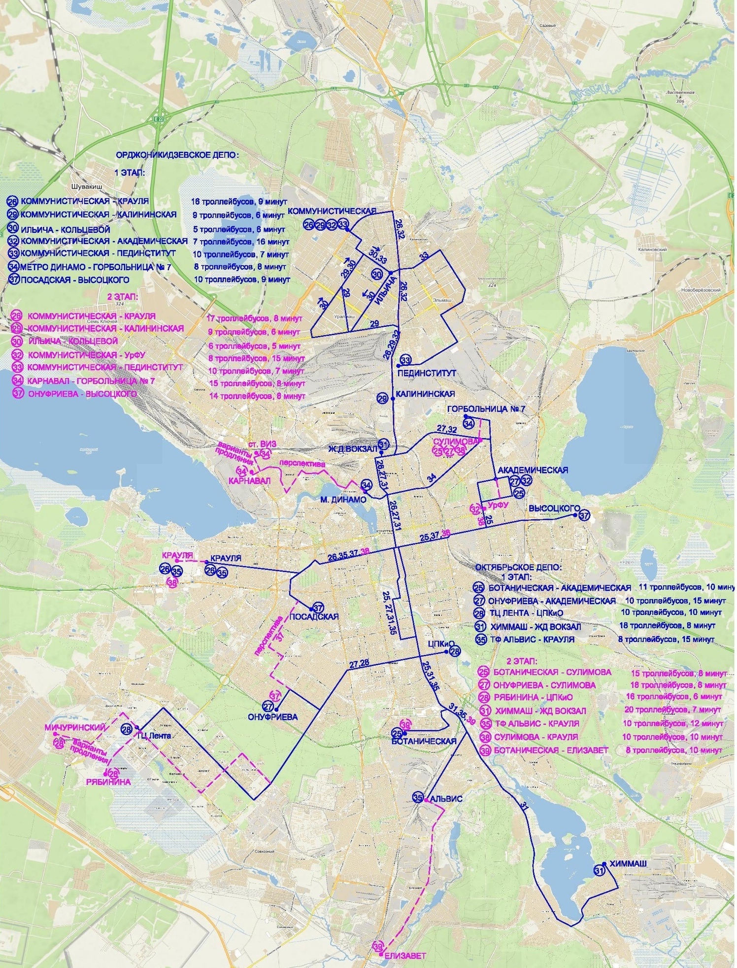 Кроме того, активисты предлагают отказаться от конечной на Академической: маршруты № 25 и №27 они хотят продлить до Сулимова, а № 32 – до УрФУ. Конечную троллейбуса № 28 предлагается перенести от ТЦ «Лента» на улицу Рябинина либо в Мичуринский микрорайон, а № 34 – от станции метро «Динамо» к ТЦ «Карнавал». Наконец, конечную остановку на Посадской тоже рекомендуют упразднить, продлив маршрут № 37 до Онуфриева.