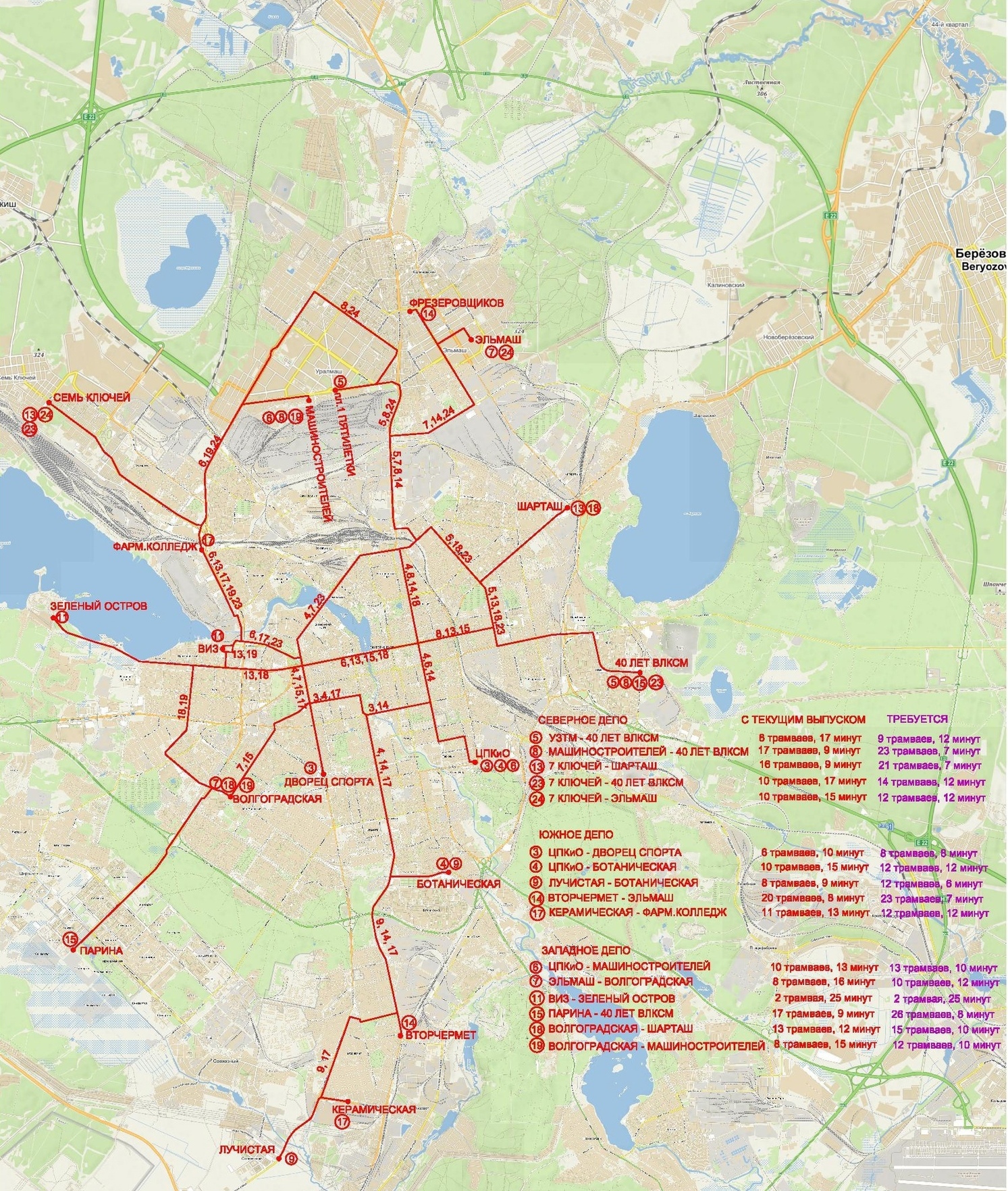 Если схему примут, трамвай № 4 с «Ботанической» будет ходить на ЦПКиО вместо Шарташа, № 5 с площади 1-й Пятилетки – на ЖБИ вместо того же Шарташа, № 7 с Эльмаша – на Волгоградскую вместо 7 Ключей, № 14 с Фрезеровщиков – на Вторчермет вместо Керамической. ЖБИ вместо Вторчермета и Машиностроителей предлагается соединить с Академическим и 7 Ключами (маршруты №15 и «21). Наконец, урбанисты выступают за запуск нового маршрута между 7 Ключами и Шарташом.
