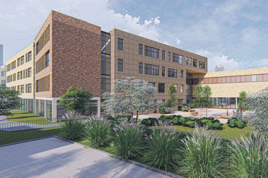 Трехэтажное здание будет разбито на учебные блоки для начальной и старшей школы, а также общешкольный блок — в нем уместят актовый, лекционный и спортивные залы, зал хореографии, библиотеку и столовую. Cтроительство школы началось в июне 2023 года. С подрядчиком заключили контракт на 2,7 миллиарда рублей.