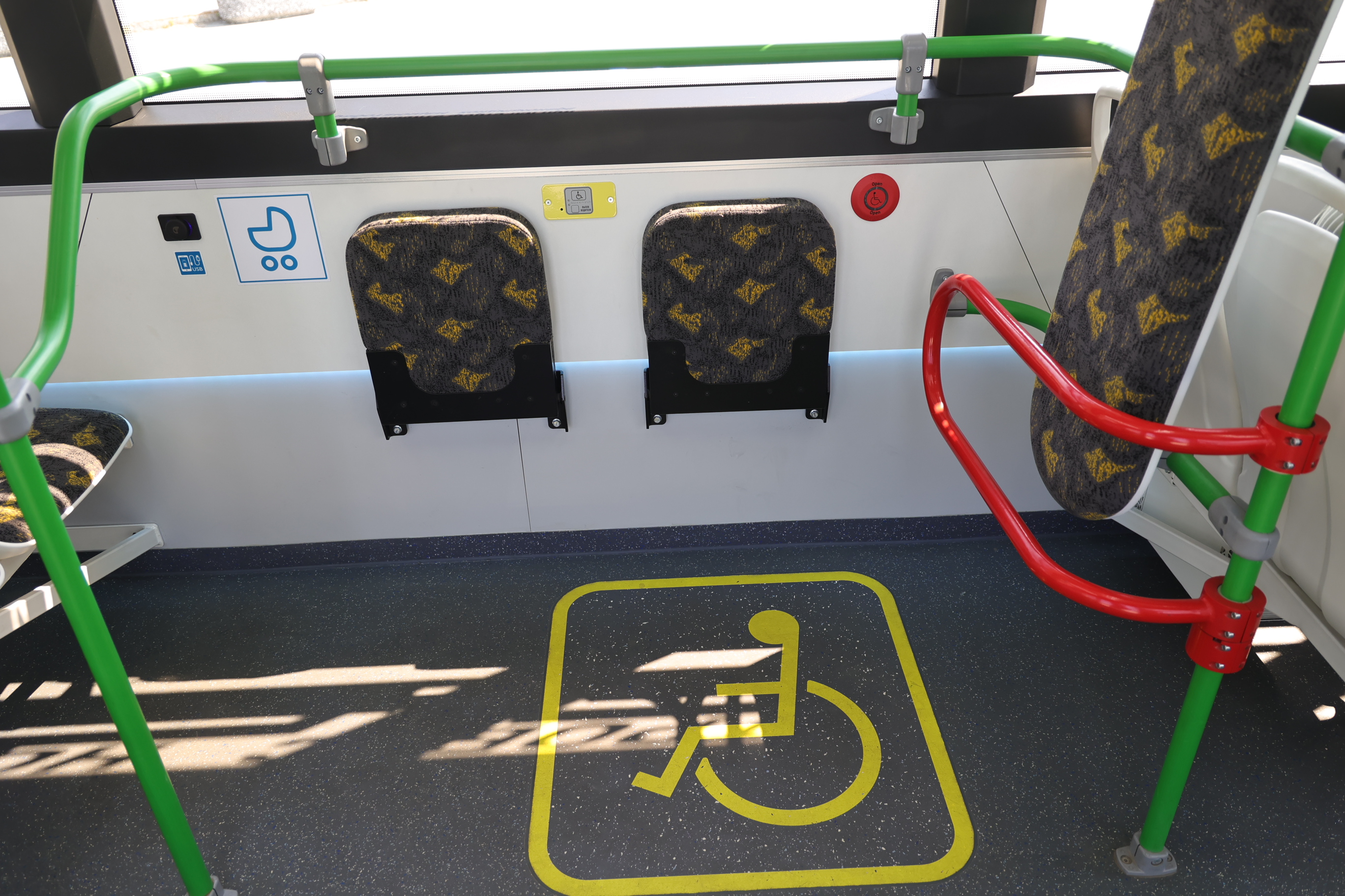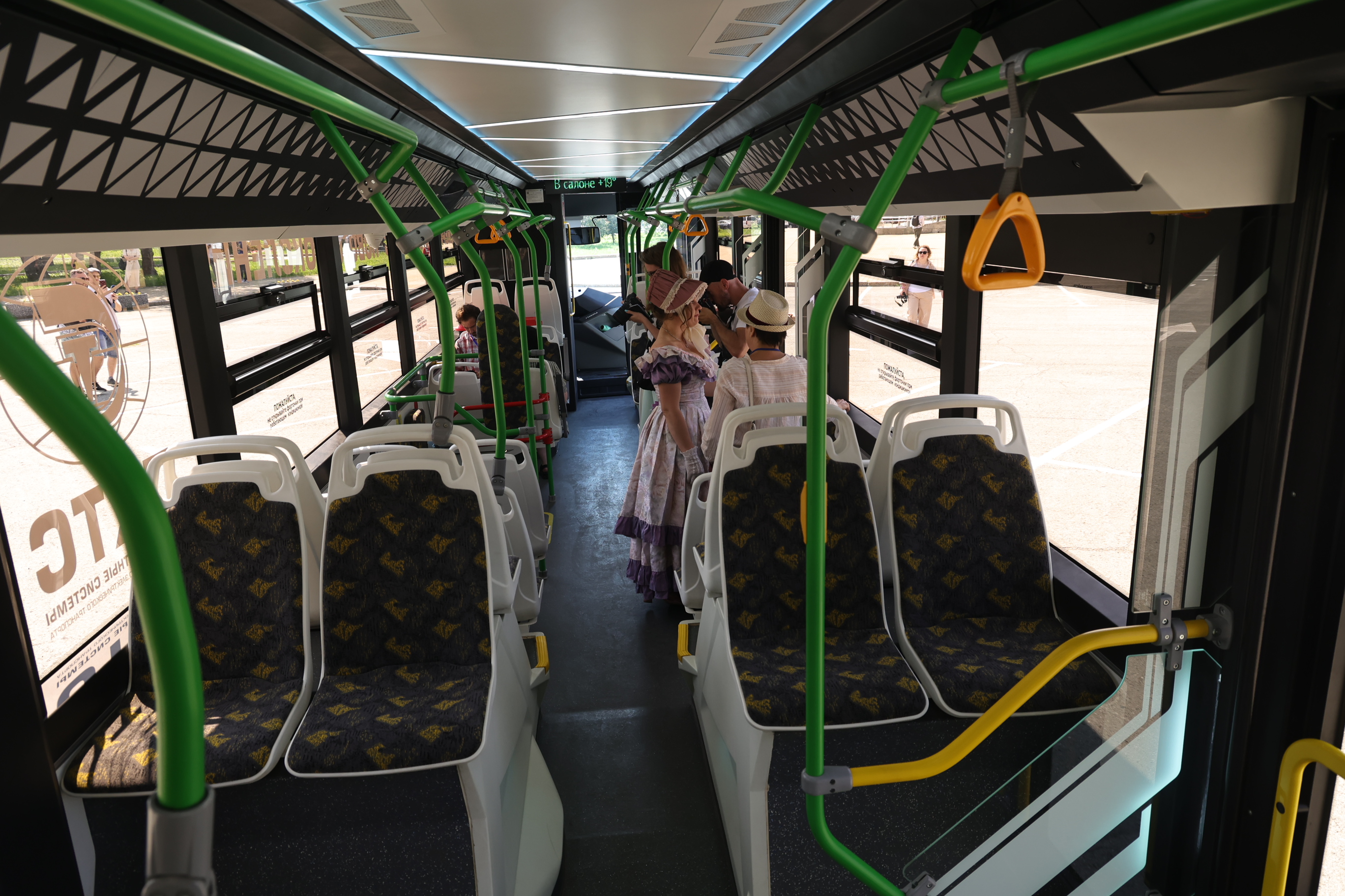 В салоне работает климат-контроль, есть зарядка, подсветка, места для колясок и кнопка и вызова водителя.