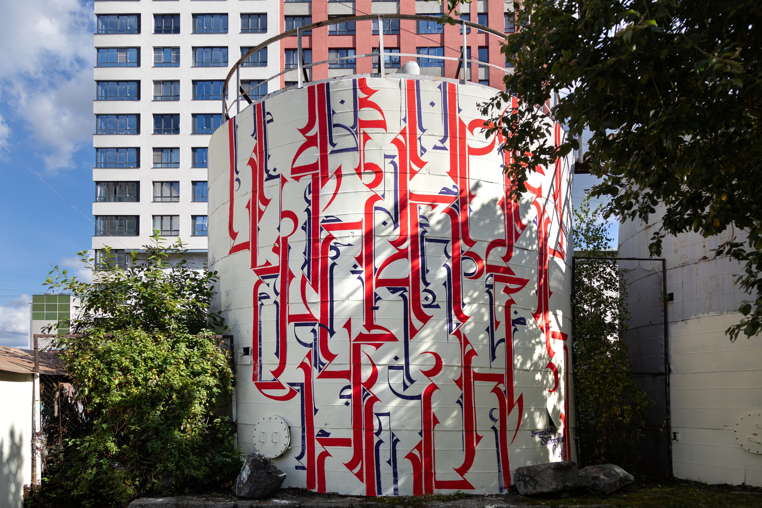 Еще один объект автора из ОАЭ появился на Академика Шварца, 18. Sneakhotep украсил вязью бочку, продемонстрировав таким образом свое прочтение мезенской росписи.