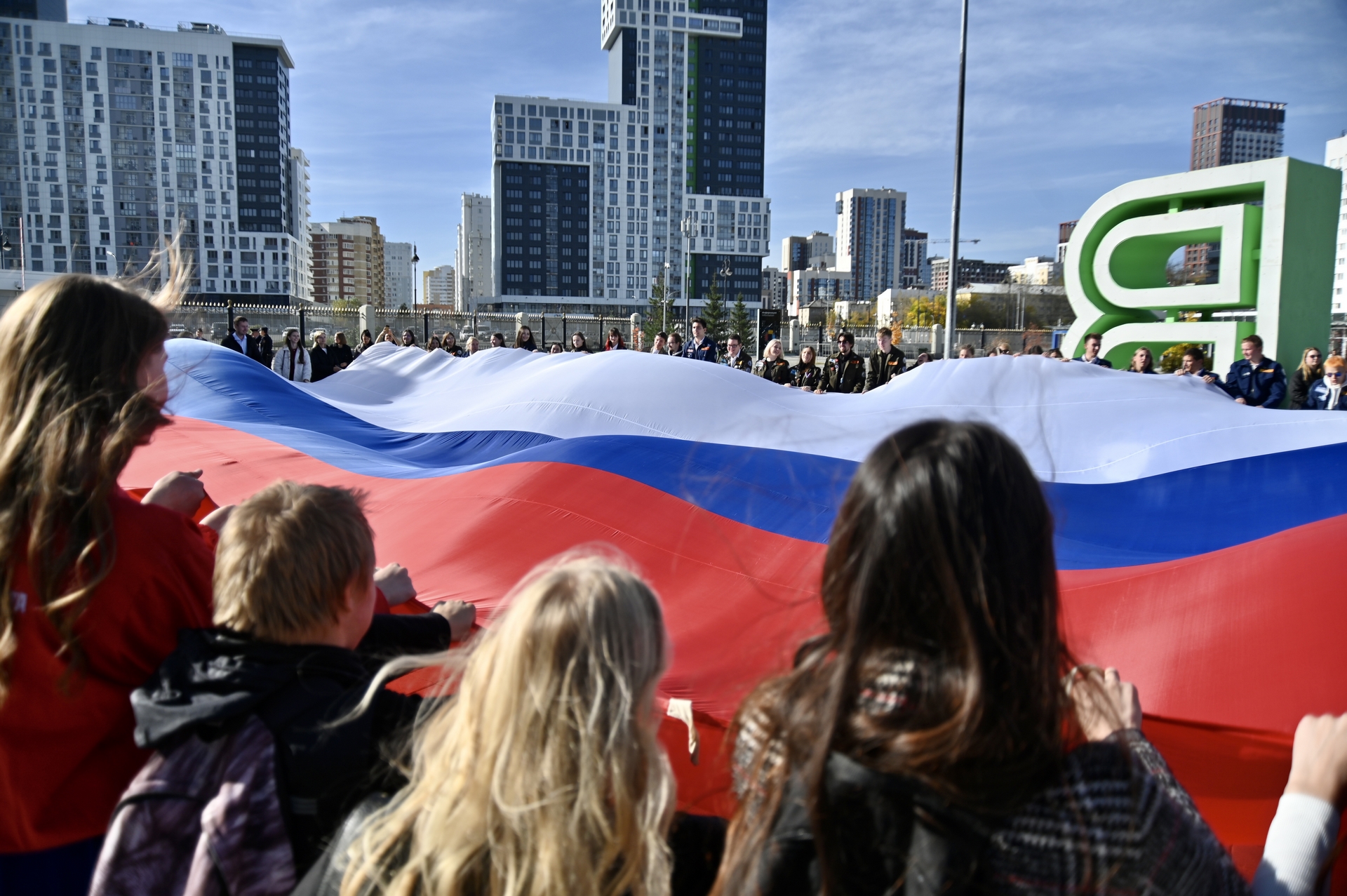 В Екатеринбурге 30 сентября состоялась патриотическая акция, посвященная годовщине воссоединения Донецкой и Луганской Народных Республик, Запорожской и Херсонской областей с Россией. Праздничная акция прошла на Центральном стадионе. Как сообщили в департаменте информполитики региона, участники развернули огромный девятиметровый флаг РФ и выстроились в форме карты, напомнив таким образом о единстве народа.