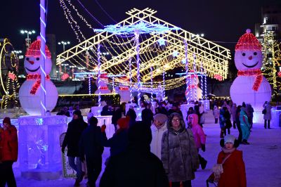 Для строительства Ледового городка в этом году было использовано более тысячи кубометров льда. Из него возвели фотозону, лабиринт, забор вокруг пруда и борты горок, а участники конкурса ледовых скульптур «Европа-Азия» вновь создали свои работы.