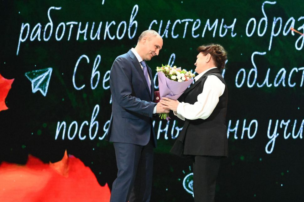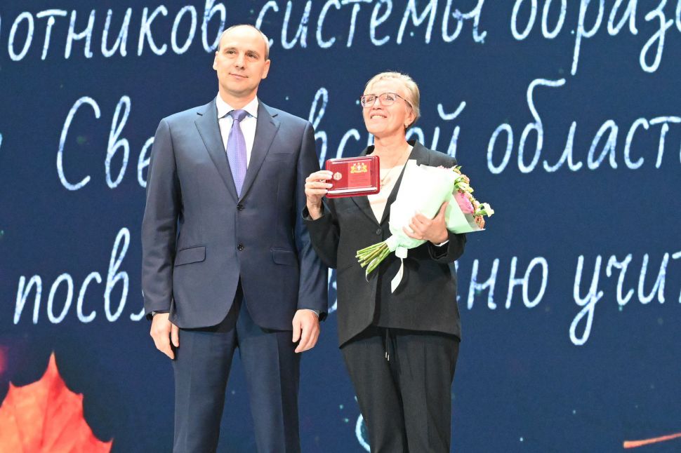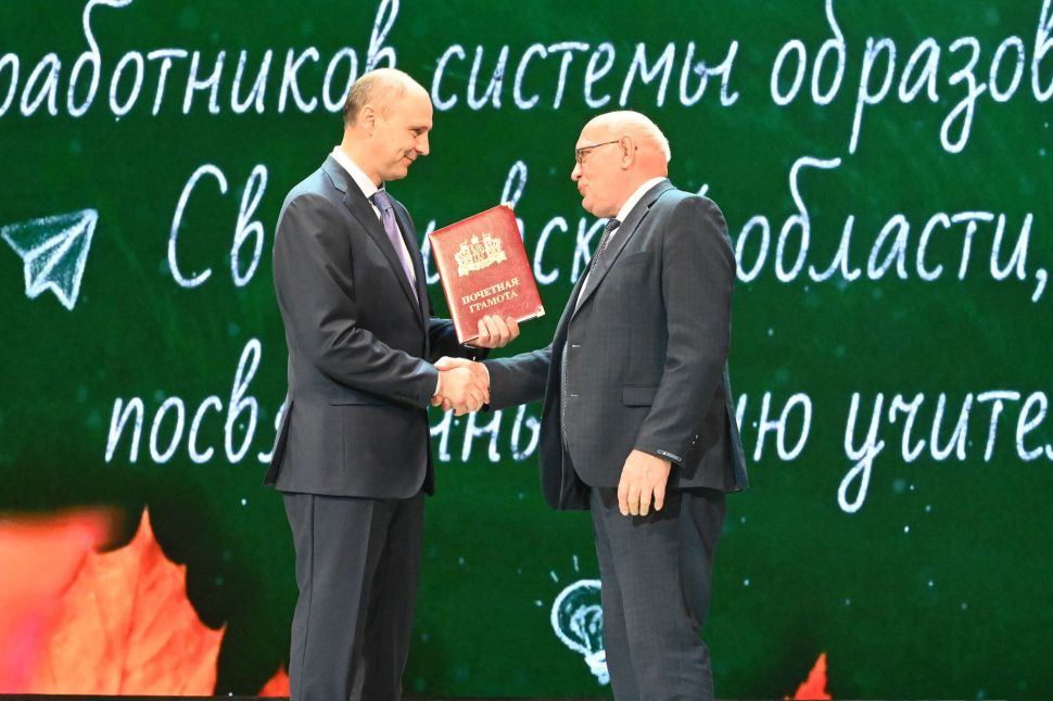 Глава региона поблагодарил педагогов за бесценные уроки, жизненную мудрость, терпение и настойчивость в воспитании юных уральцев, а также вручил почётное звание «Заслуженный учитель Свердловской области» шести педагогам из Екатеринбурга, Берёзовского, Тавды, Новой Ляли и Алапаевска. Всего такой награды удостоены более 40 человек.