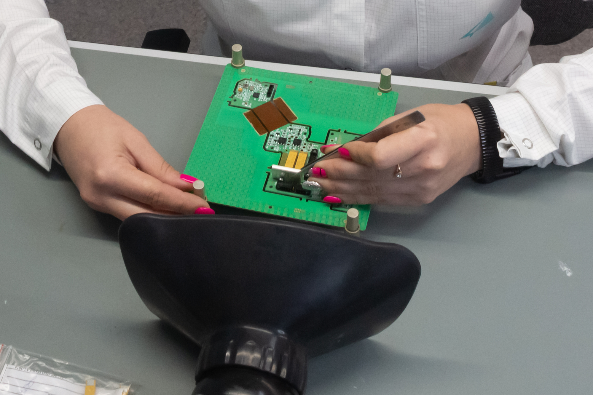 В УПКБ «Деталь» Диана Курилова работает с 2017 года — пришла на предприятие сразу после курсов монтажника радиоэлектронной аппаратуры и приборов ученицей. Дальше — планомерный рост: 3-й разряд, затем 4-й и 5-й.