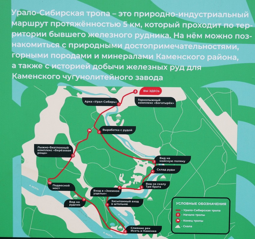 Природно-индустриальный маршрут протяженностью около пяти километров начинается у горно-лыжного комплекса «Богатырек», где установлена арка «Урал – Сибирь».