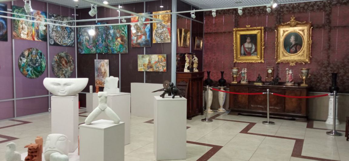 С одной стороны – современные художники: метамодернистские полотна члена Союза художников России Киры Мофа-Саргон, историческая серия кораблей от Станислава Круппа и экспериментальная скульптура из газобетона от четы Лесухиных из Челябинска. С другой – антикварные вазы, часы и картины из соседнего салона.