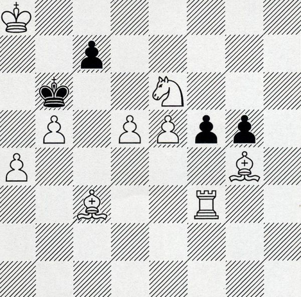 Белые: Kpb7, Фg2, Лb4, Cb3, Kc4. Черные: Kpd4, п. g6. Мат в 2 хода.